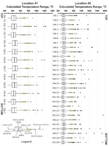 So to remedy this, we derived formulas for estimating temperature from reflectance from 11 studies and applied each formula to each measurement made on every sample. This resulted in tens of thousands of estimates for each site and usually between 1100 to 1200 temperature estimates for each sample; thus, making a very robust statistical estimate of the temperature of formation for the fossil charcoal (i.e. fusinite) in each and every sample. Not just a single point with no way of telling what the variance (and error) might be.