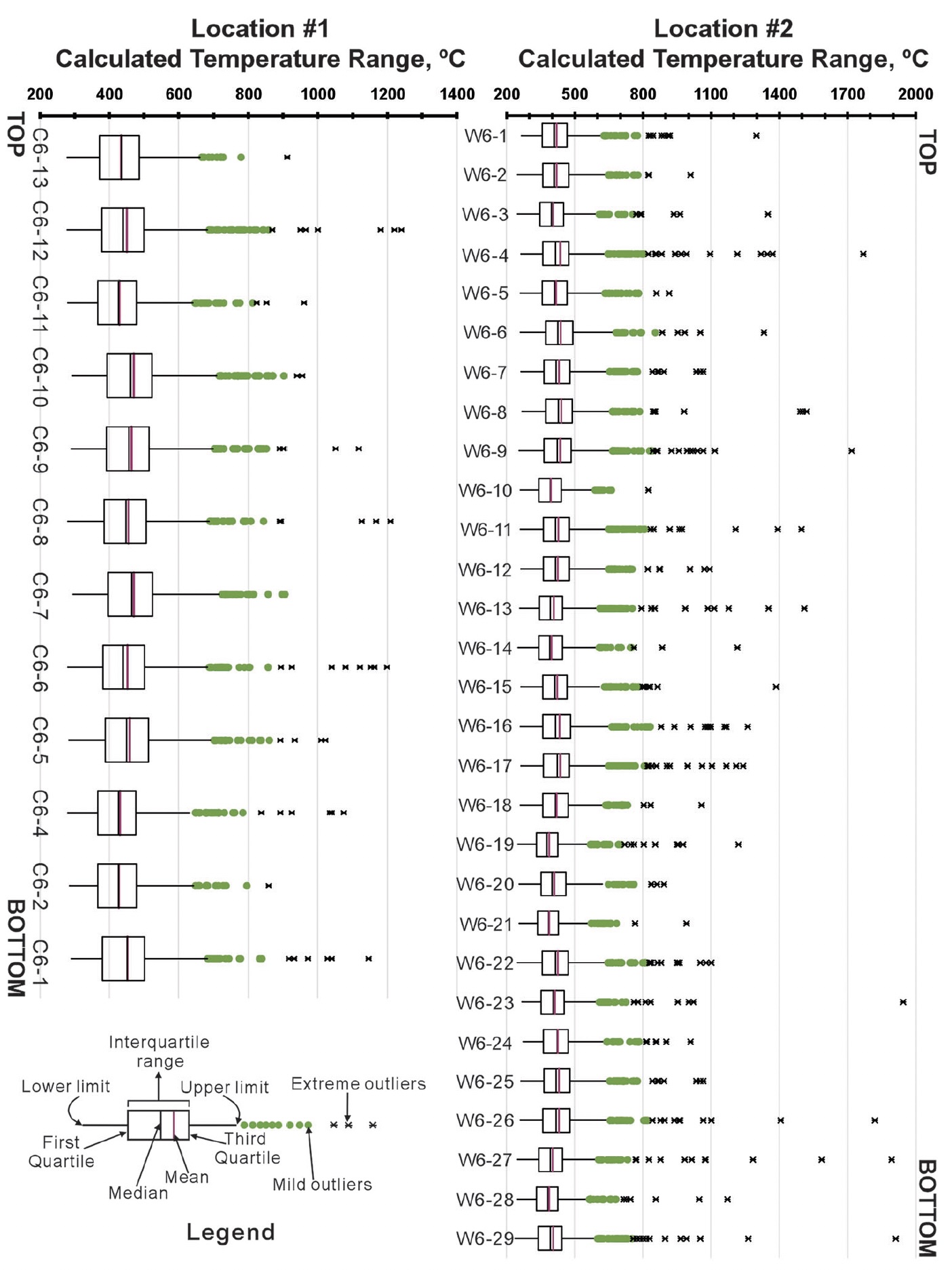 So to remedy this, we derived formulas for estimating temperature from reflectance from 11 studies and applied each formula to each measurement made on every sample. This resulted in tens of thousands of estimates for each site and usually between 1100 to 1200 temperature estimates for each sample; thus, making a very robust statistical estimate of the temperature of formation for the fossil charcoal (i.e. fusinite) in each and every sample. Not just a single point with no way of telling what the variance (and error) might be.