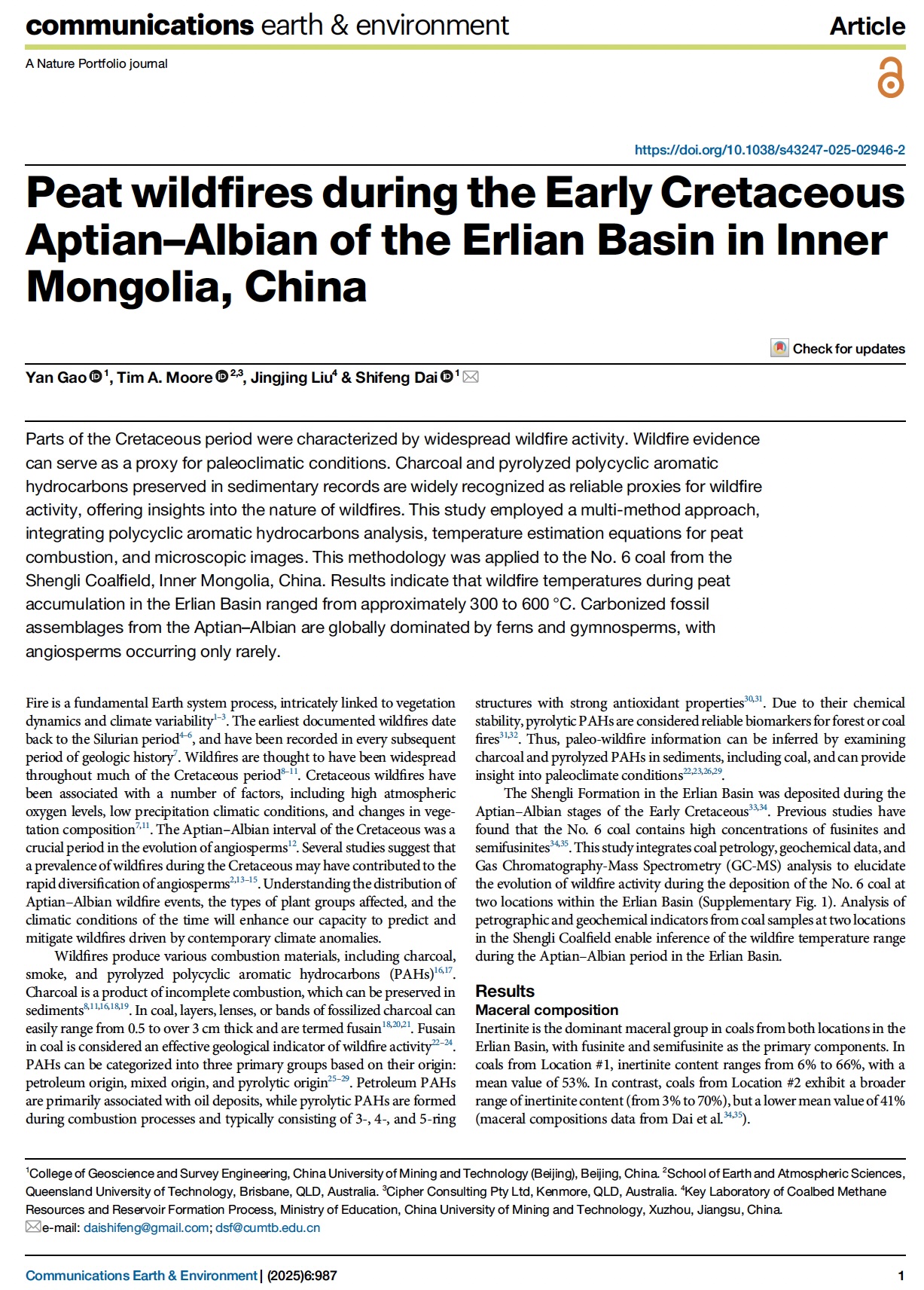 *Gao, Y., Moore, T.A., Liu, J., Dai, S. Peat wildfires during the Early Cretaceous Aptian–Albian of the Erlian Basin in Inner Mongolia, China. Commun Earth Environ 6, 987 (2025). https://doi.org/10.1038/s43247-025-02946-2